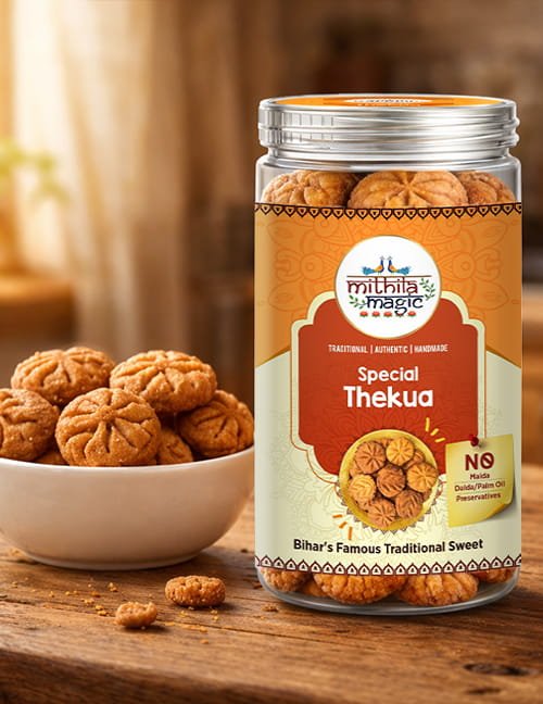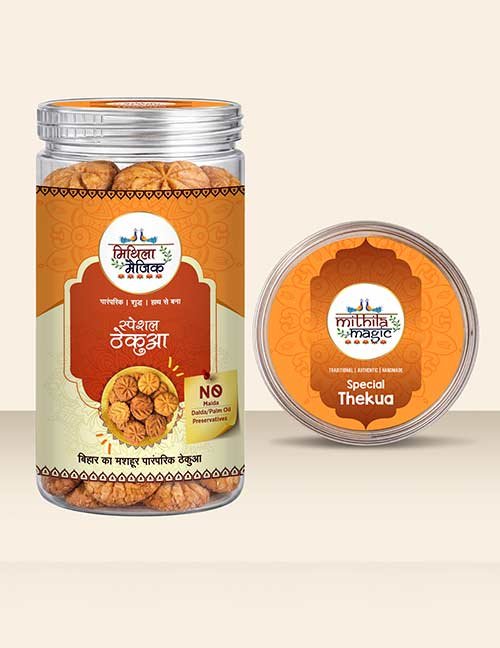 Special Thekua is a unique variation of the traditional Mithila delicacy, made with sugar and a hint of salt for a perfectly balanced sweet and savory taste. Deeply rooted in Mithila culture and cherished during Chhath Puja, it is crafted using time-honoured recipes and rich desi ghee, giving it a distinctive aroma and flavor. With a crisp texture on the outside and a soft, rich bite inside, it makes a perfect chai-time or everyday snack. Prepared in small batches with quality ingredients and no additives, it delivers authentic taste in every bite.
