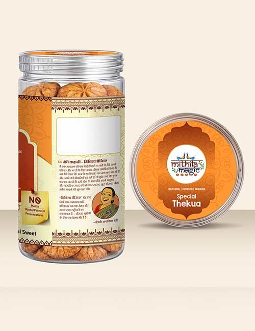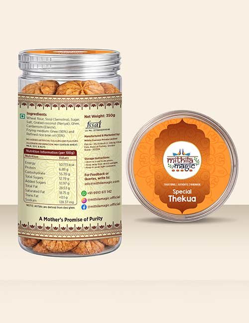 Special Thekua is a unique variation of the traditional Mithila delicacy, made with sugar and a hint of salt for a perfectly balanced sweet and savory taste. Deeply rooted in Mithila culture and cherished during Chhath Puja, it is crafted using time-honoured recipes and rich desi ghee, giving it a distinctive aroma and flavor. With a crisp texture on the outside and a soft, rich bite inside, it makes a perfect chai-time or everyday snack. Prepared in small batches with quality ingredients and no additives, it delivers authentic taste in every bite.